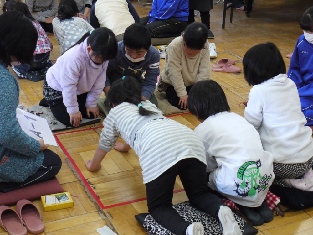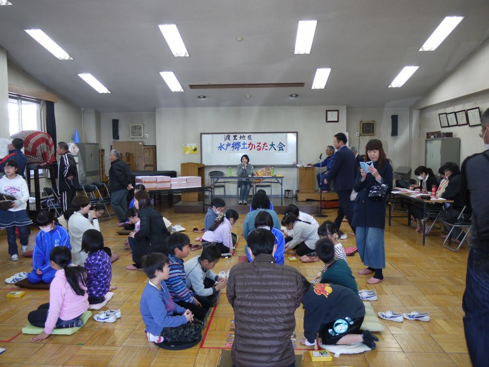 渡里住民の会 生涯学習部の主催による「平成28年度水戸郷土かるた 渡里地区大会」が、平成29年1月15日 (日)に渡里市民センター ホールにて開催されました。大会運営には渡里子ども会育成連合会があたり、大勢の参加者と応援の家族で賑やかに行われました。座布団に正座した三人一組の参加者により、対面するチームとの戦いが始まり、詠みあげられたカルタに素早く反応していました。小学低学年と高学年の2グループに分かれて競い合い、最終的に優勝と準優勝の各2チームが渡里地区代表として、2月18日に開催される中央大会への参加資格が与えられました。三位までの入賞者には表彰状と副賞の果物詰め合わせ、更には優勝と準優勝にはトロフィーの授与もあり、最後に参加者全員に参加賞が手渡され楽しかった催しも終了となりました。